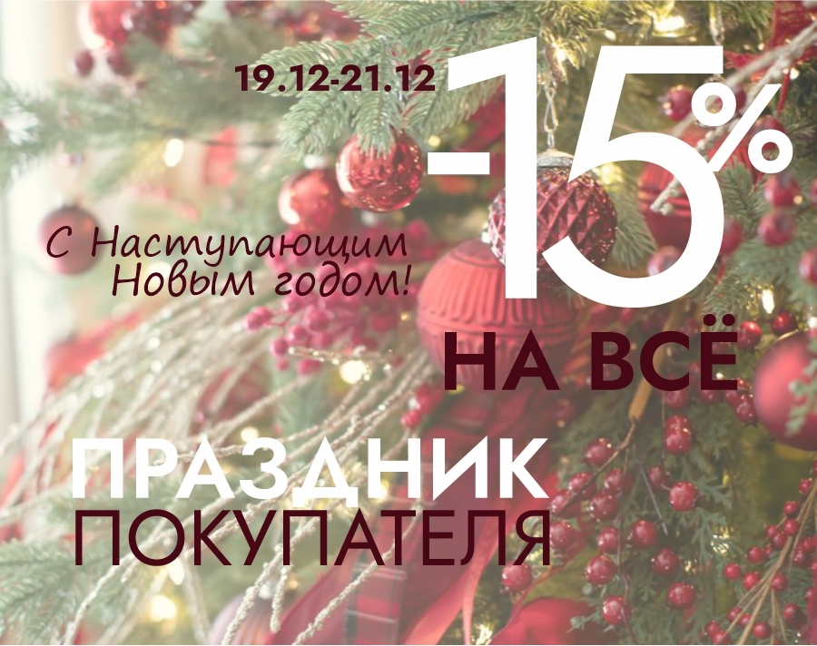 Только в Праздник Покупателя 19-21 декабря супер скидка на весь ассортимент салона – 15%.