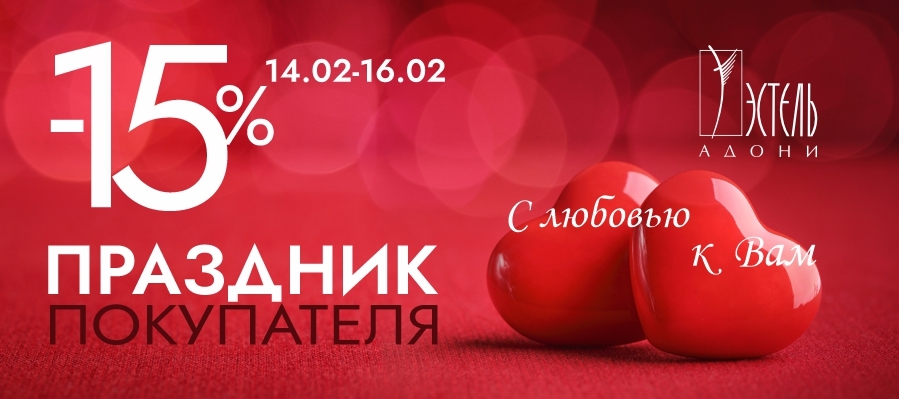 Поздравляем с Днем святого Валентина и дарим ВАМ скидку 15% на весь ассортимент салона только 14-16 февраля.